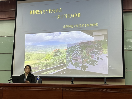 在报告会上,徐晓伟教授从美术学专业写生创作课中的观察与提炼、当代艺术中的绘画创作、深入生活塑造可信、可爱、可敬的中国形象三方面展开讲解。她从写生、创作课中普遍存在的问题与现象入手,通过对作品的分析与比较,探讨写生创作的意义,以恢宏、开放的视野举例阐述了当代艺术中个性独特的艺术家作品,鼓励学生深入生活、勤于观察、创作个人独特视角的艺术作品。