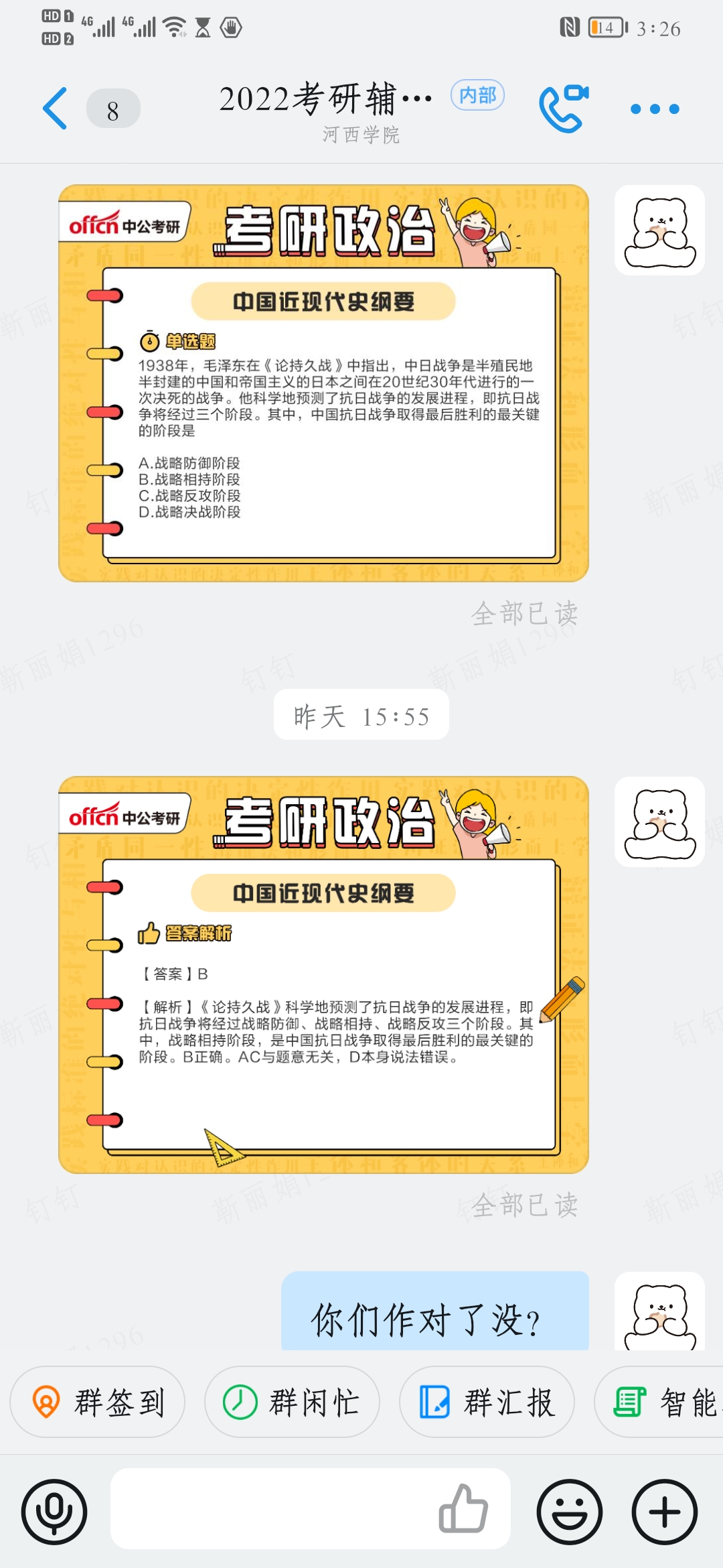 在这个特殊时期,党支部充分发挥战斗堡垒作用给予学生更多人文关怀和支持帮助,在线上开展考研讲座,引导学生了解考研形势、把握政策导向、明确考研目标,对如何权衡就业与考研做好指引。并定期与学生沟通交流,及时关注学生的学习和心理状态,鼓励学生在考研路上坚定理想信念、矢志拼搏奋斗,提醒学生学会调节情绪、释放压力;同时建立考研辅导群为同学们提供辅导帮扶、考研复习资料和每日一练等,多措并举助力考研学子。